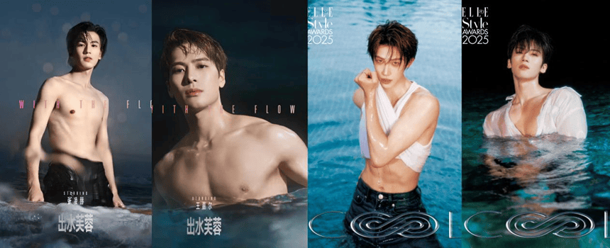 ELLE今年的“海浪・星光”主题与此前GQ的海边派对相似,导致两组物料出现雷同:王嘉尔、张凌赫2021年GQ红毯的“出水芙蓉”大片,与刘宇、闫桉今年ELLE的官方物料,都是泡在水中展示身材。
