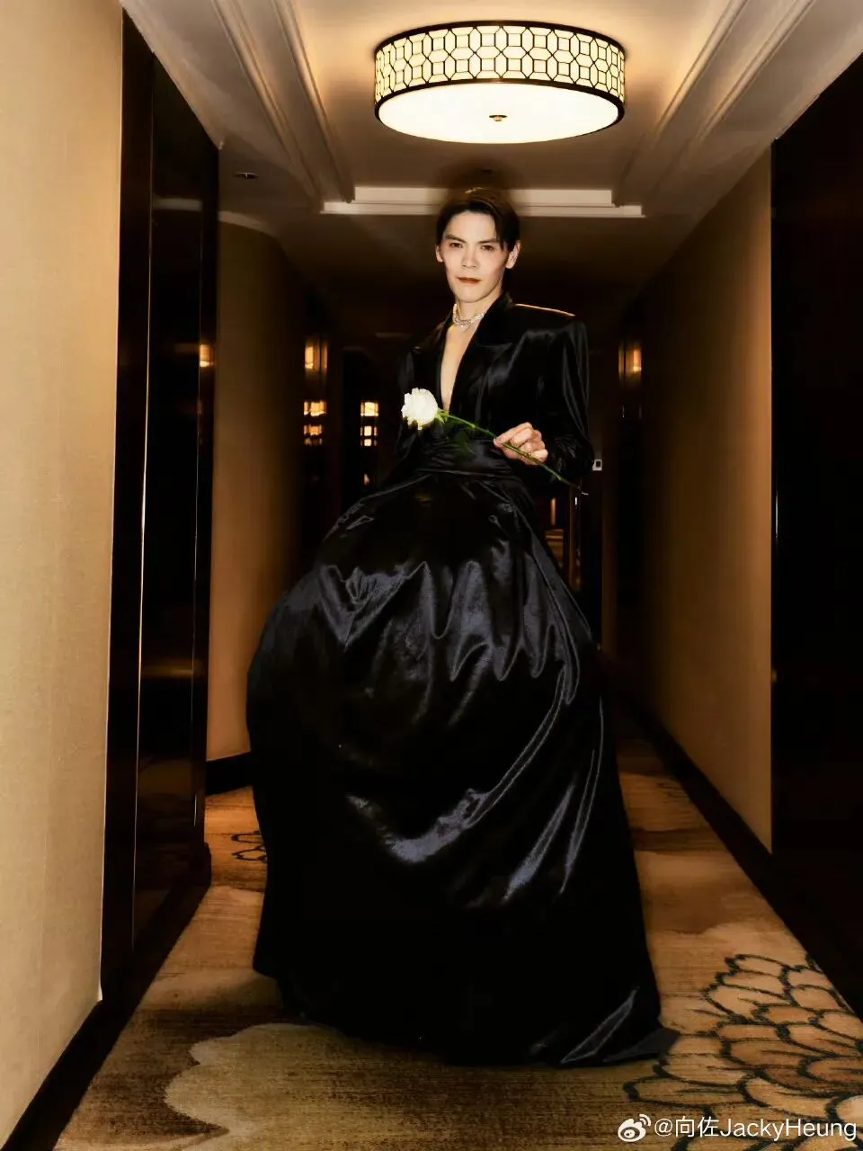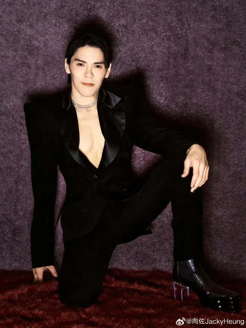 只见他穿着一套全黑色的礼服,脚上一双透明跟的恨天高。