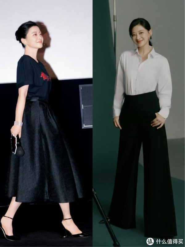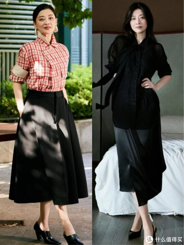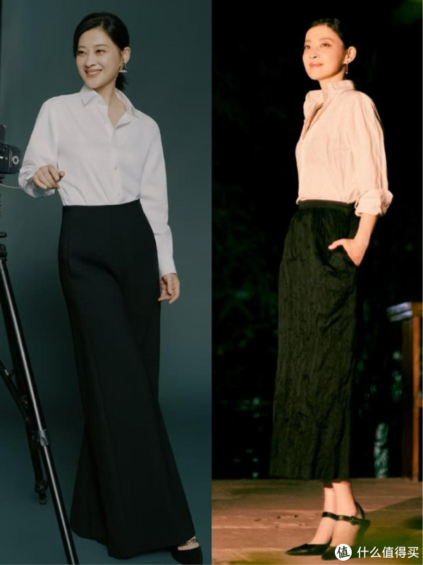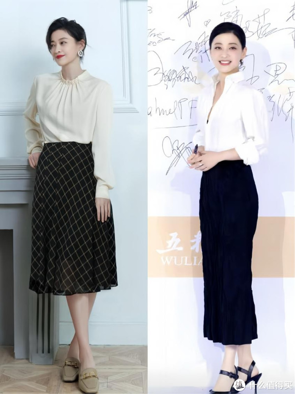此外,她还特别偏爱中长款裙装的搭配,比如 A 字裙、直筒裙,既能遮盖腿部线条,又能凸显女性的柔美,像这种衬衫搭配半身裙的造型,自带女人味,再配上一双浅口高跟鞋,优雅又知性,不经意间就优化了比例,显得身材特别好。